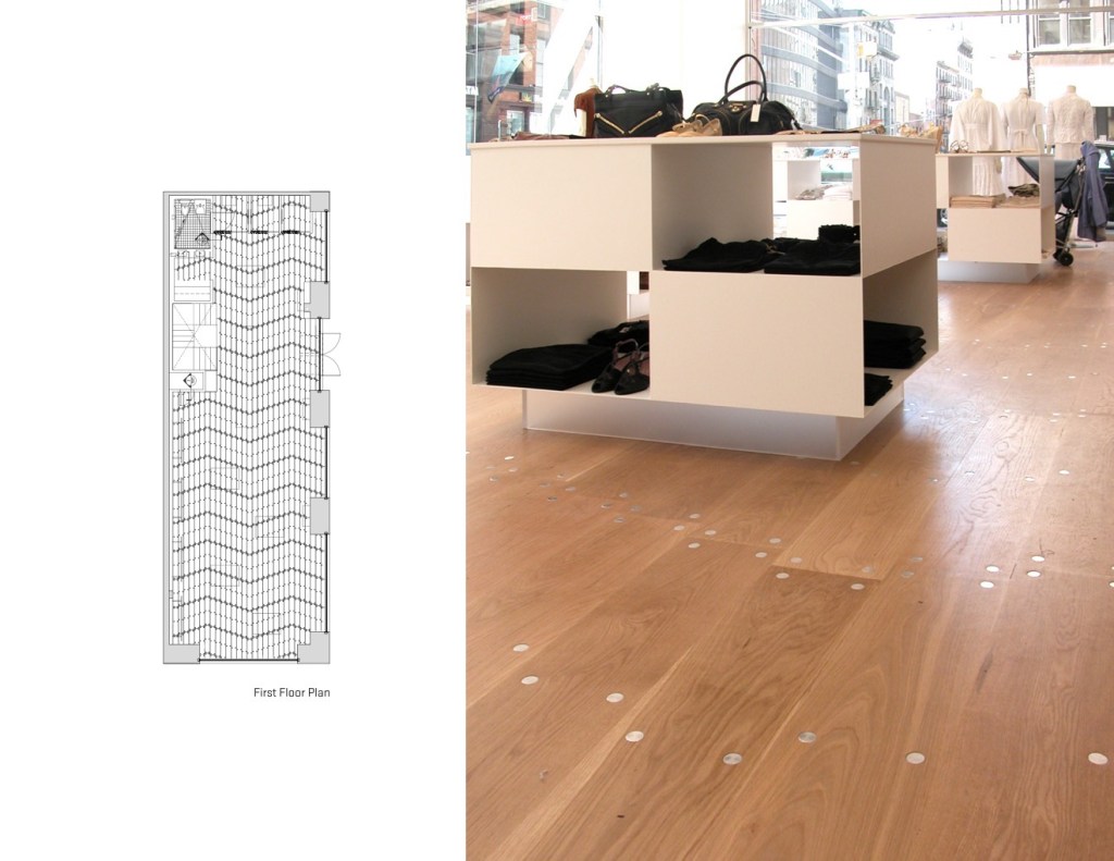 Renovation of a 3300 sf interior and basement for a retail boutique located in New York City’s trendy SoHo District. This project used a subdued palette to exploit the vibrancy of the colorful clothes and combined sleek and rough textures of lacquer, acrylic, stainless steel and unfinished wood. The design also included custom display furniture and fixtures.
