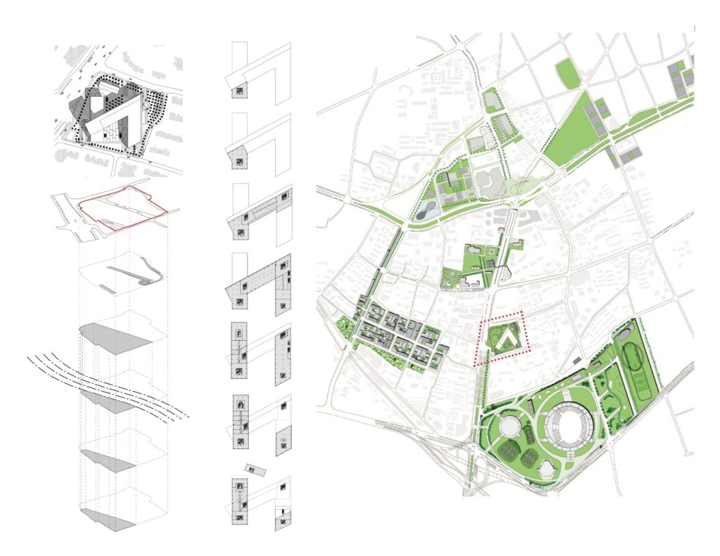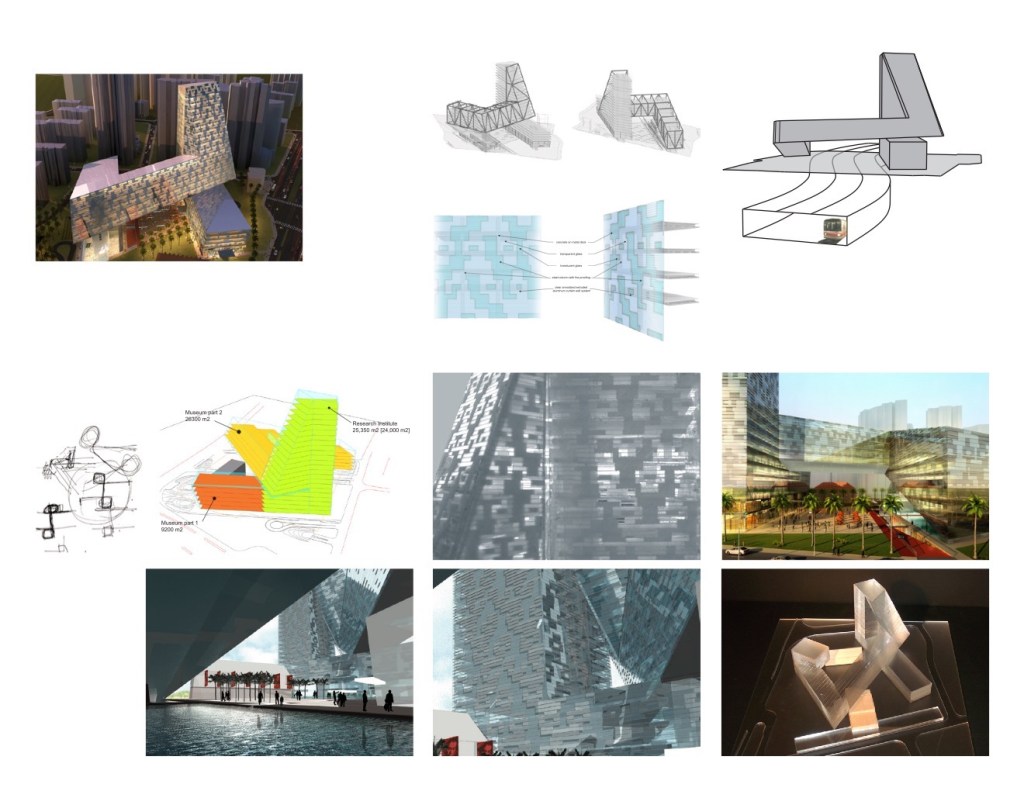93,000 s.m. complex for the Xu Jia Hui urban district of Shanghai housing a new museum and center for research sought to be a focal point of this budding film district and the Shanghai Film Festival. In this complex site, this building negotiates a balance of bridging the subway below, stringent sun lighting restrictions, and a requirement of 70% site greenery.