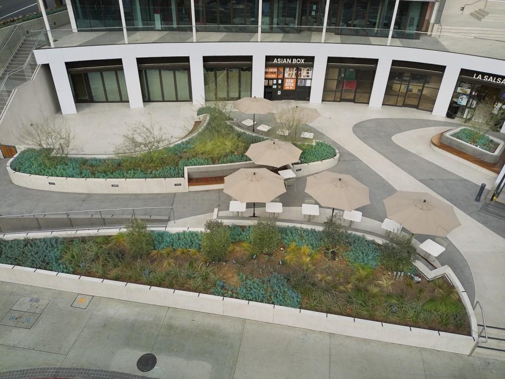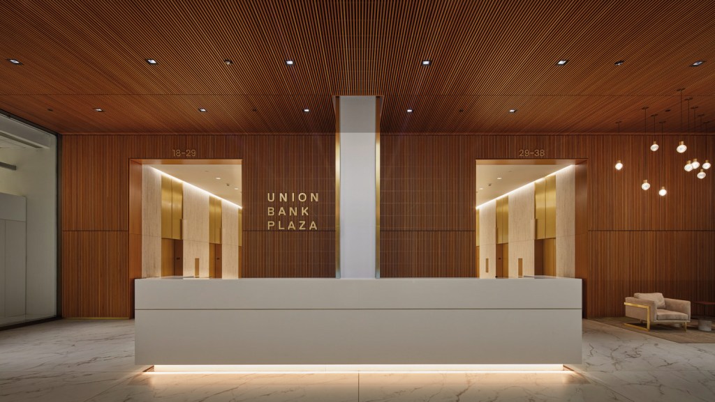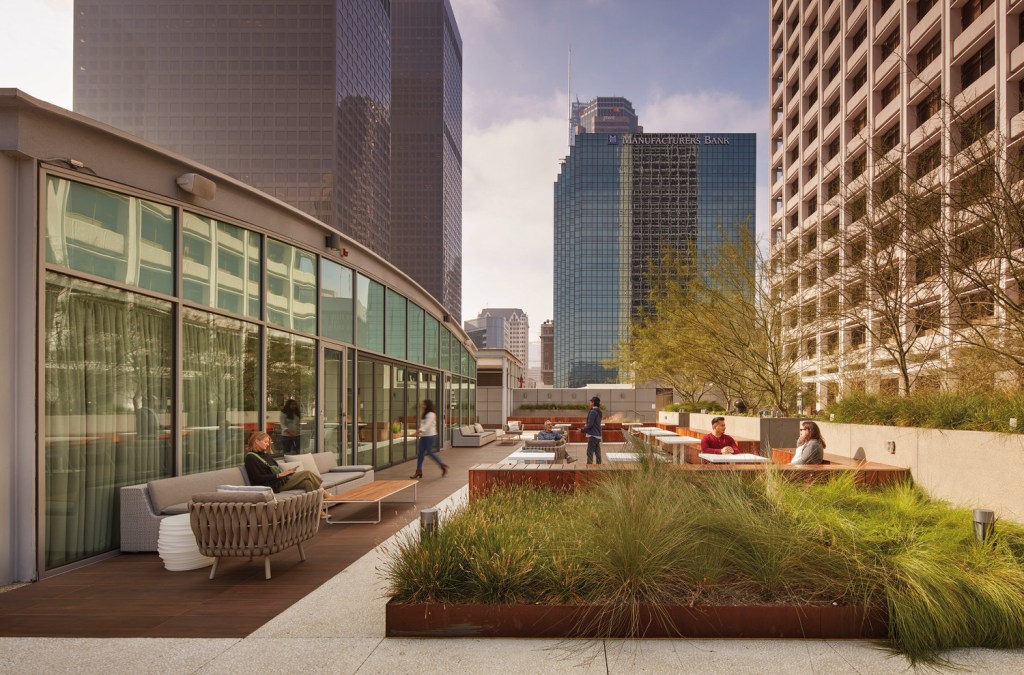 Located at the historic Union Bank Tower, this commission was to renovate all public areas of this iconic 1968 landmark building in downtown Los Angeles The stunning lobby update brings contemporary flair to the classic modern architecture of the building. while a new outdoor tenant amenity area connects the lobby with renovated conference center and activates the upper plaza. Our intervention included the street-level plaza on the corner of 5th Street and Figueroa. New facades, canopy and extensive landscaping transform it into an urban garden that invites the public to wander in, hang out or enjoy the outdoor restaurant seating.